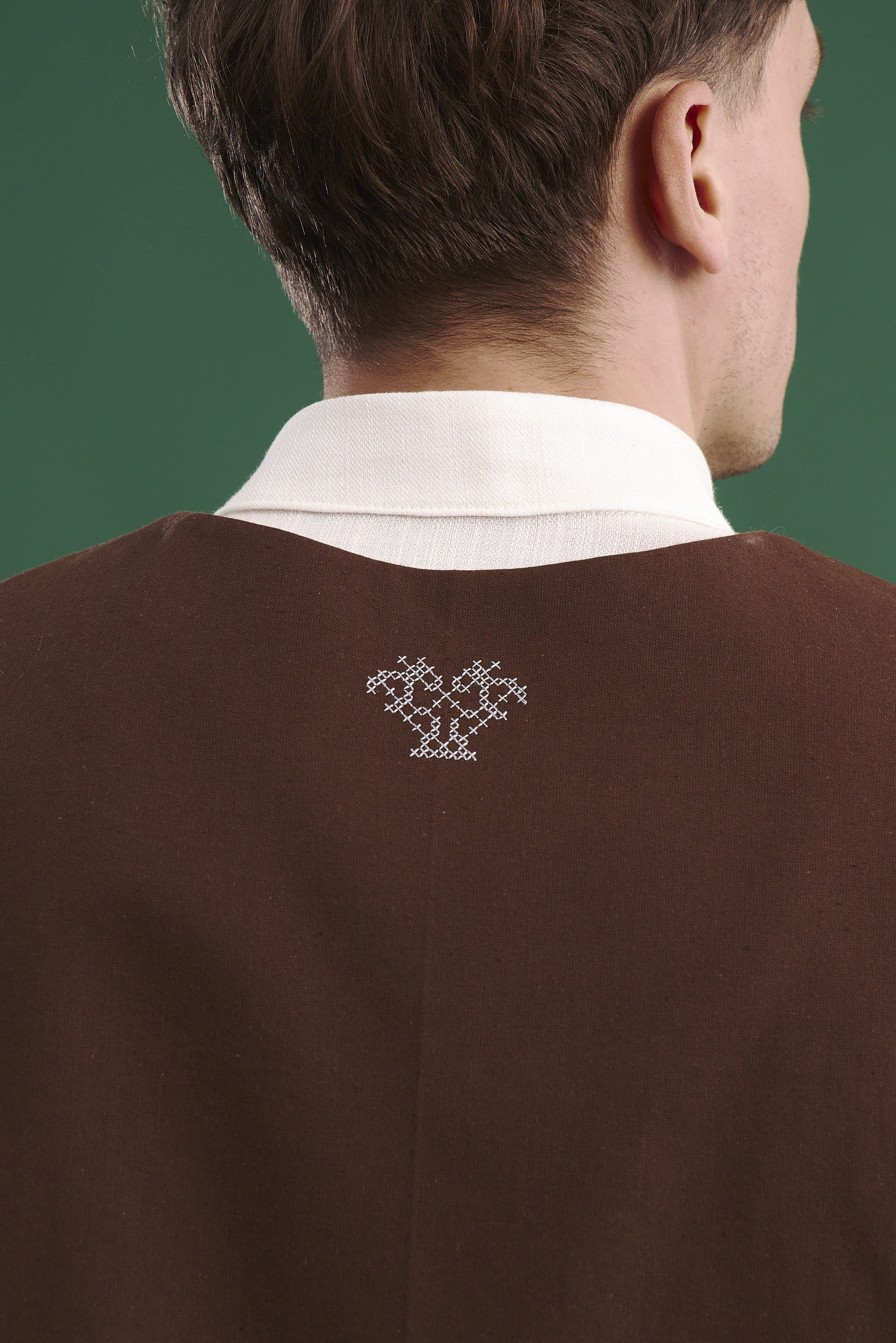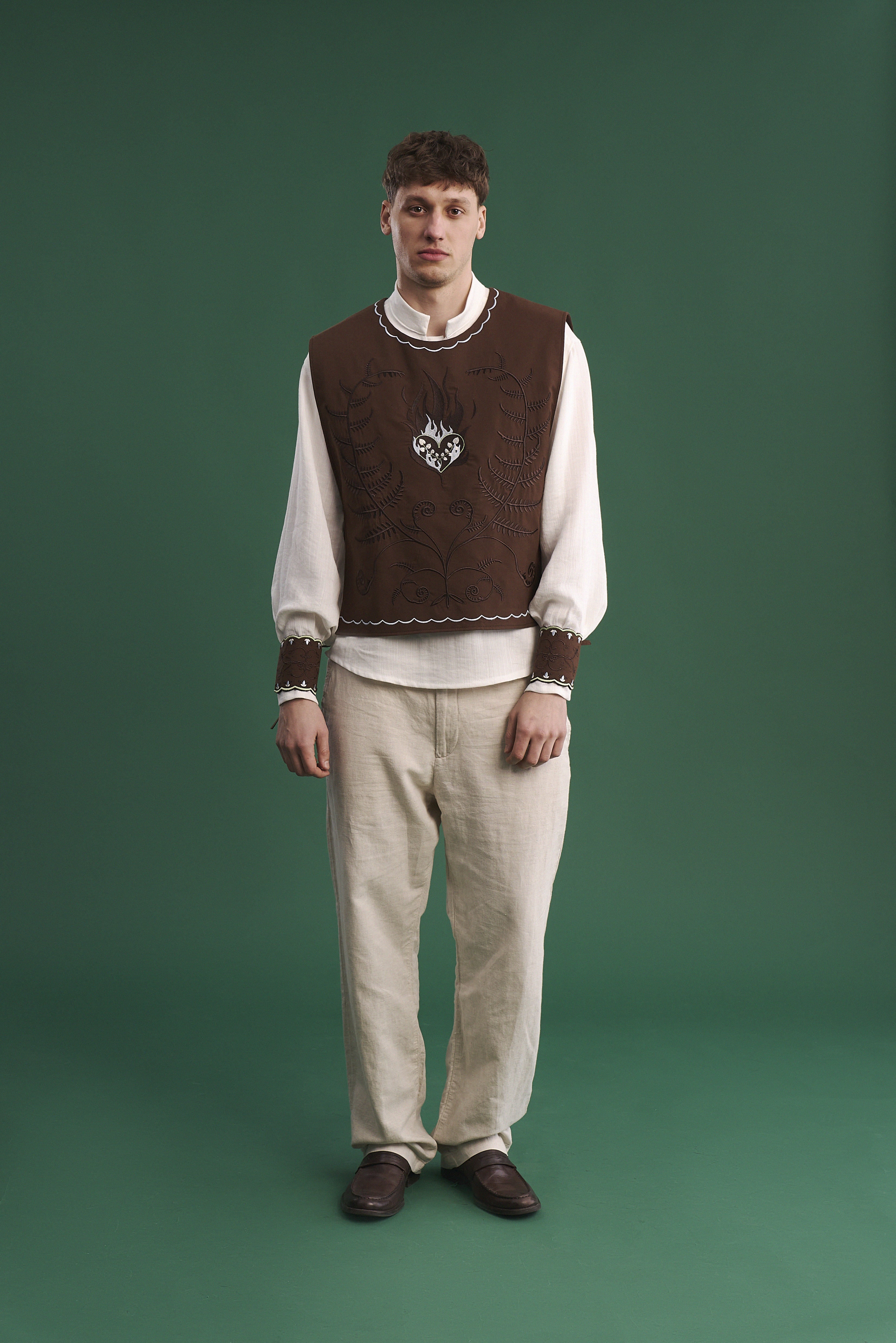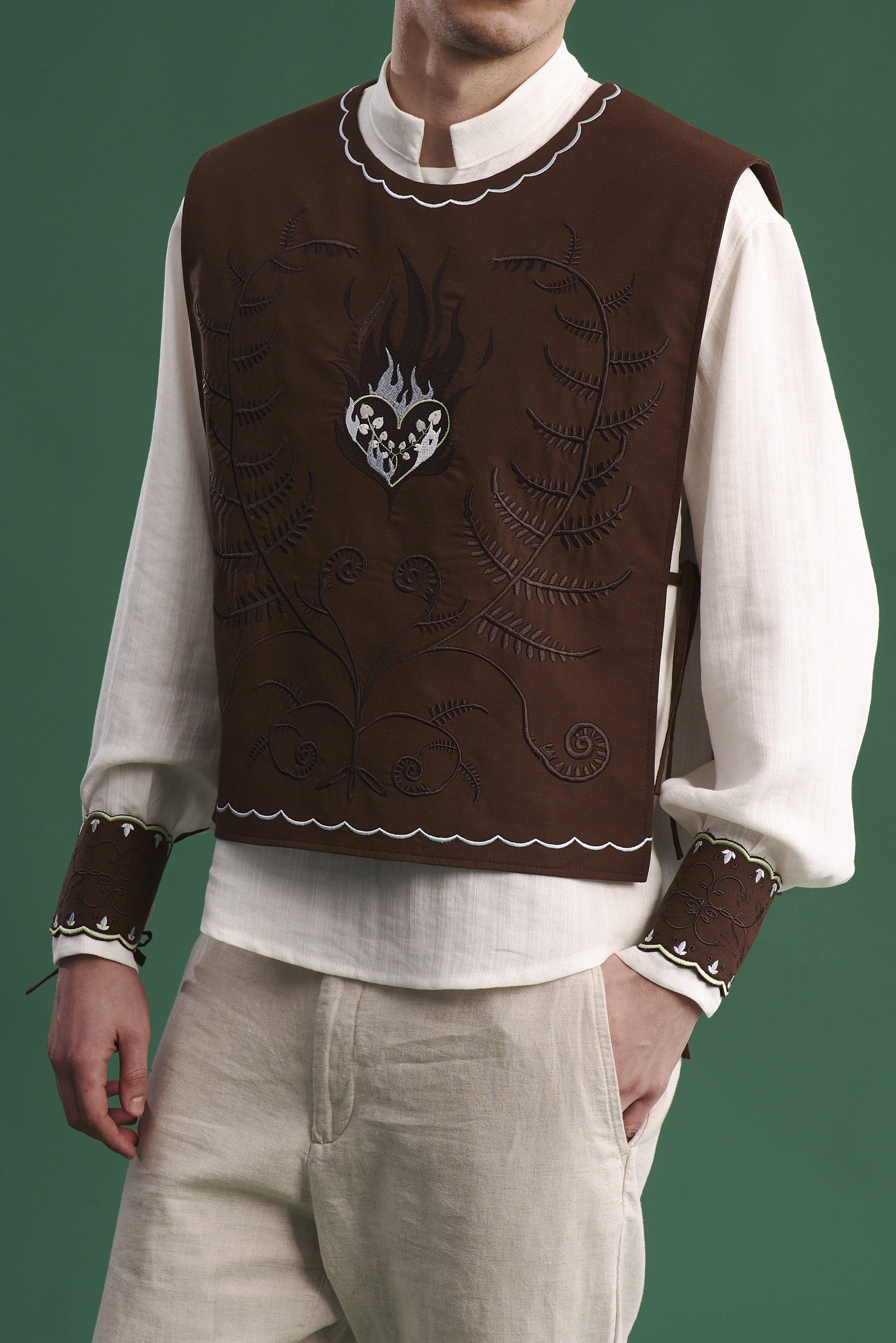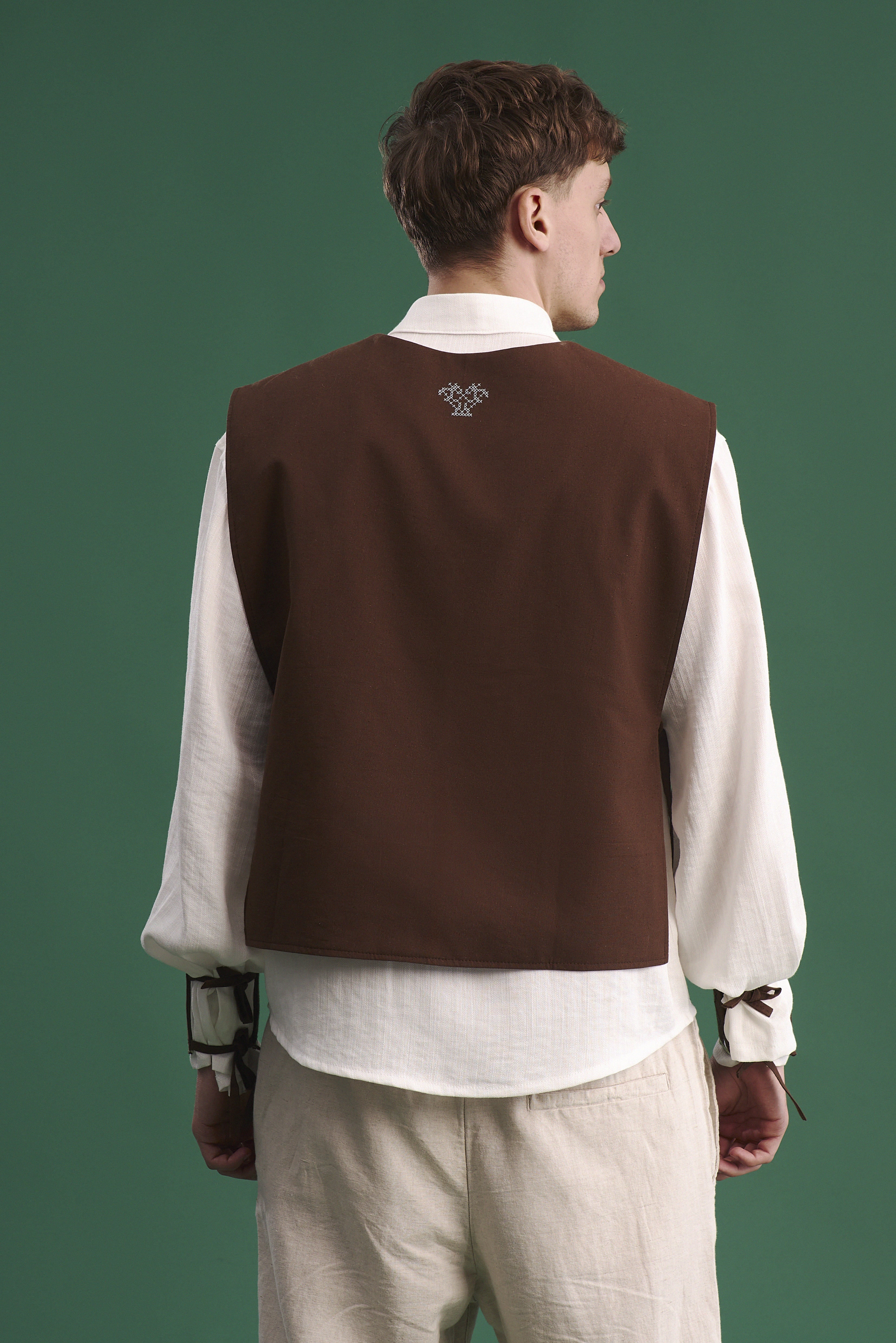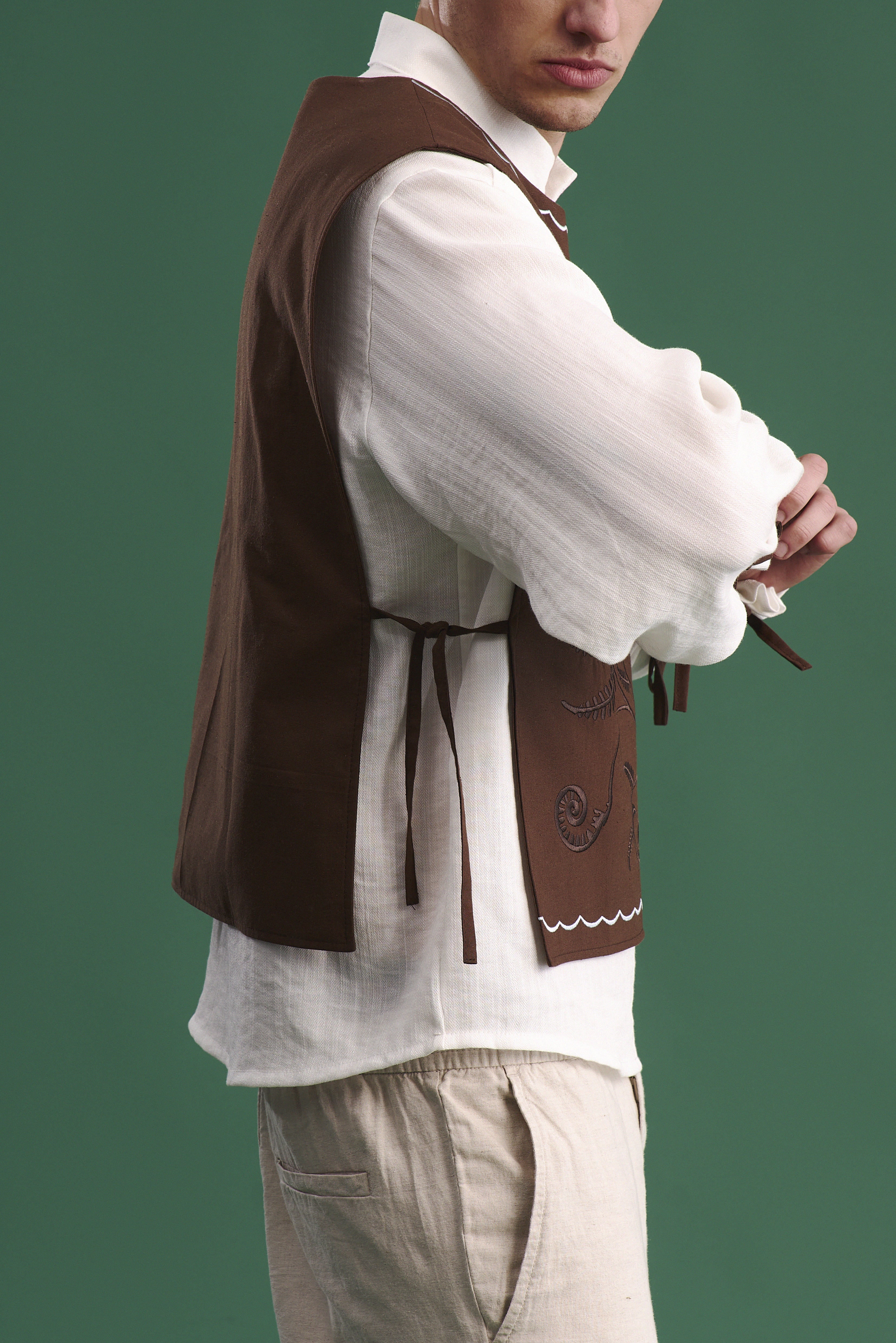 Комізелька чоловіча “Знак полум'я” — це поєднання традиційної форми та глибокого символізму, закладеного у вишивці. Виконана з натуральної бязі шоколадного кольору, вона має лаконічний крій та зав’язки з боків, що дозволяють регулювати посадку.