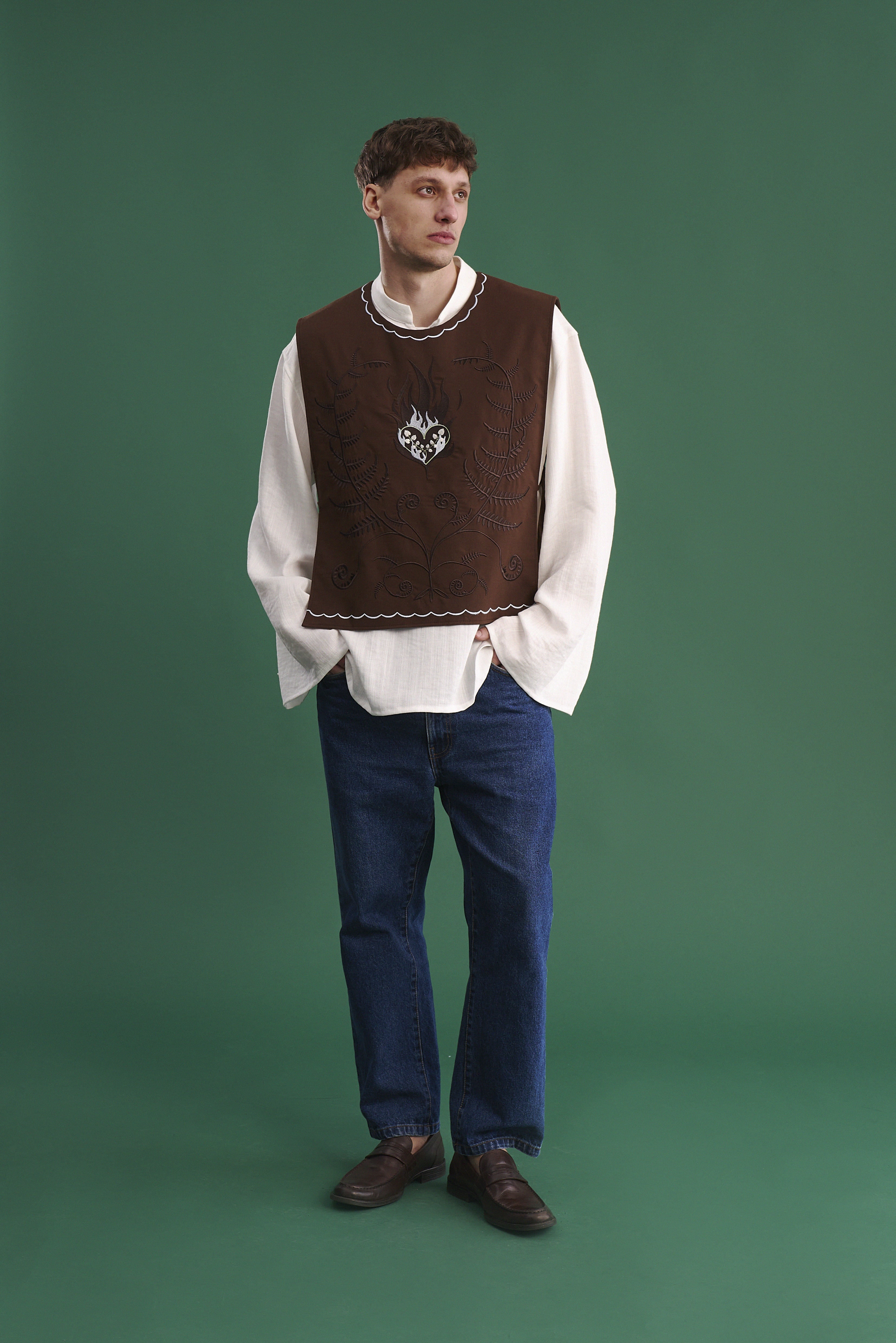 Головний акцент — масивна вишивка на полочці та фірмове лого на спині. Візерунок натхненний історією кохання Мавки й Перелесника — уявного світу, де міфічні істоти обирають бути разом, всупереч усьому. Це символ про силу почуттів, вибір і внутрішній вогонь.