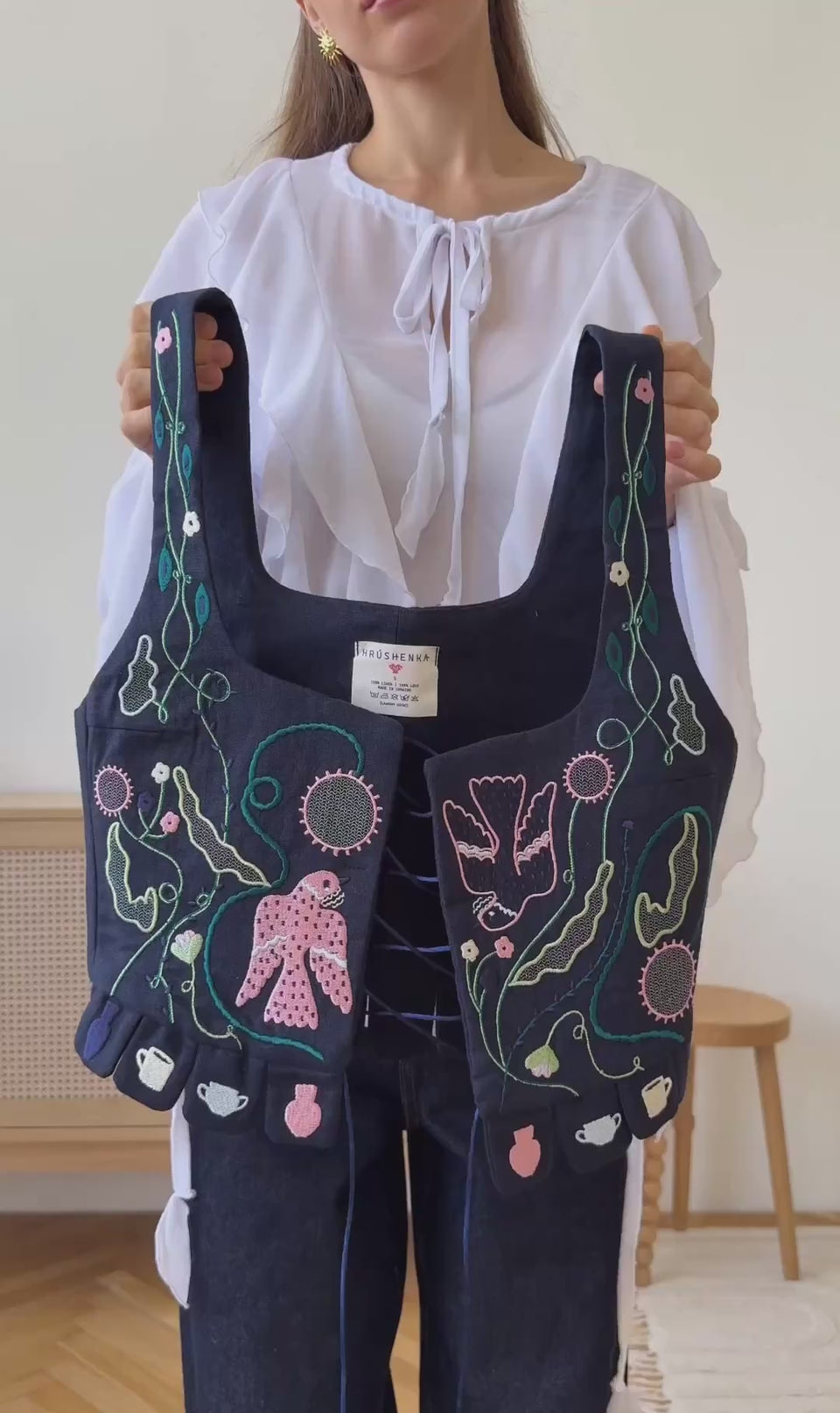 Вишивка на корсеті відтворює цю особливу стилістику: яскраві кольори, декоративні крила, квіти — все, що робило її мистецтво впізнаваним і теплим. Це не просто аксесуар, а візуальна поезія, присвячена пам’яті народної художниці й тій невичерпній душевності, яку вона вкладала в кожен свій образ.