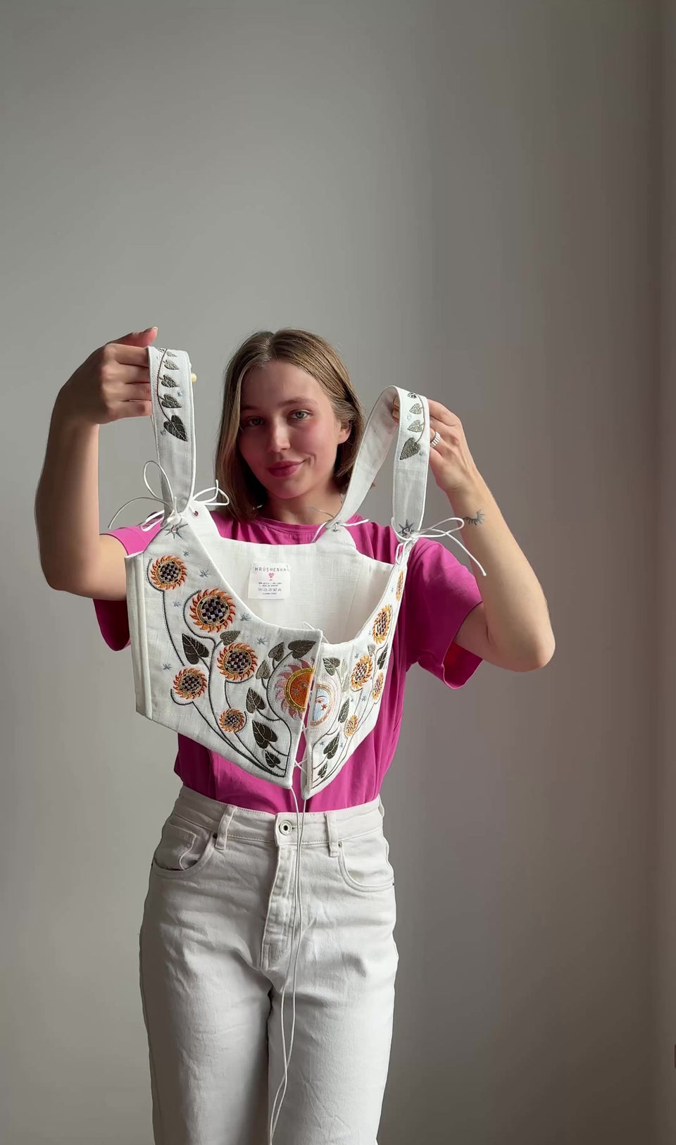 Корсет з вишивкою "Соняшник" — це не просто елемент одягу, а символ внутрішньої сили та гармонії. Білий фон і яскрава вишивка соняшників уособлюють світло, стійкість та надію.