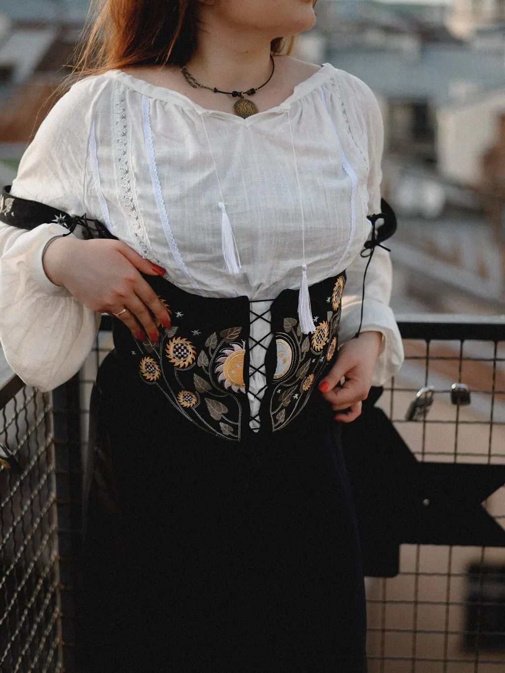 The women's corset with "Sunflower" embroidery in black tells a story of unity between light and shadow, life between the Sun and the Moon. One half blazes with gold, like the midday sun; the other softly glows, like a quiet night.