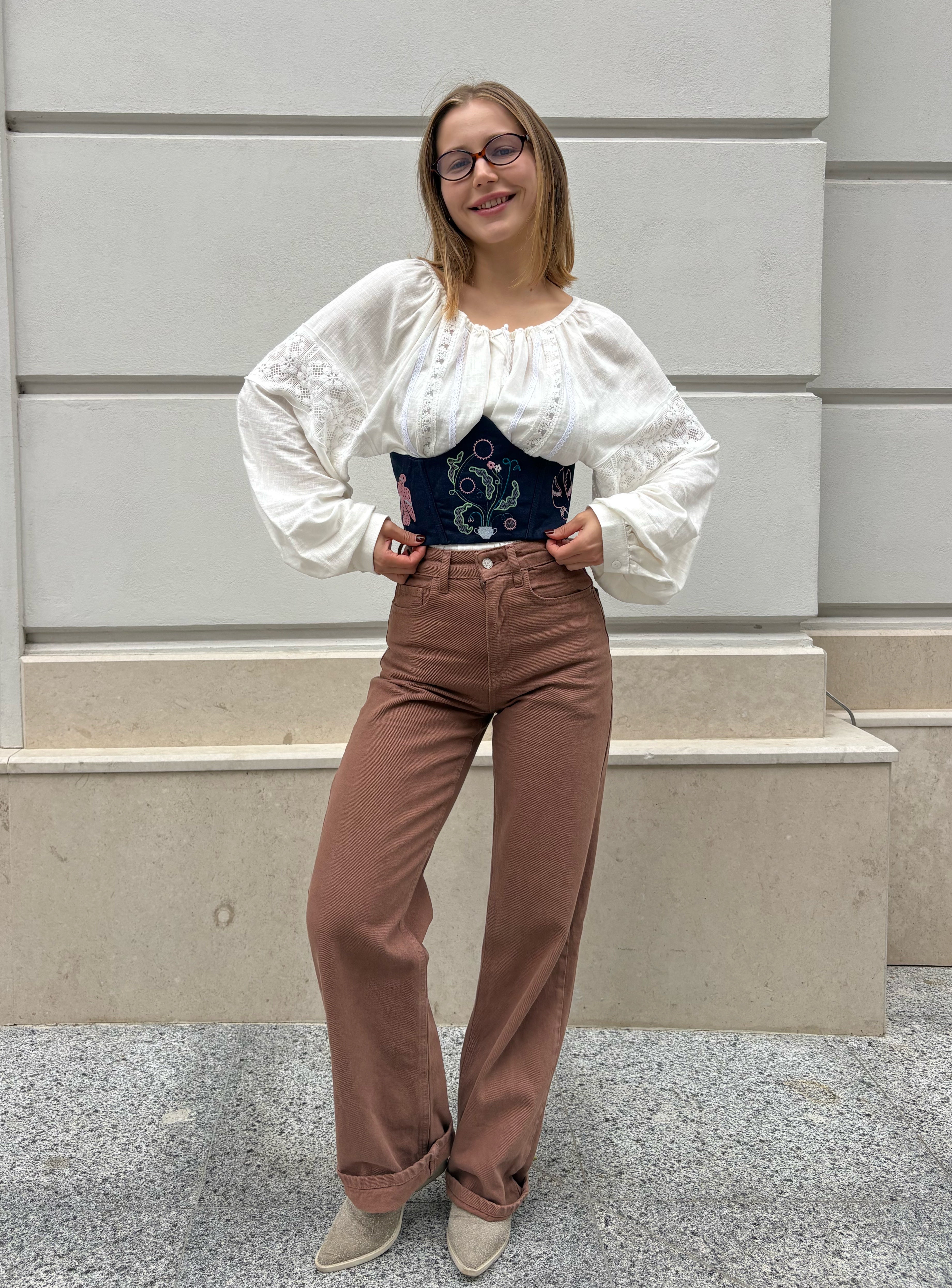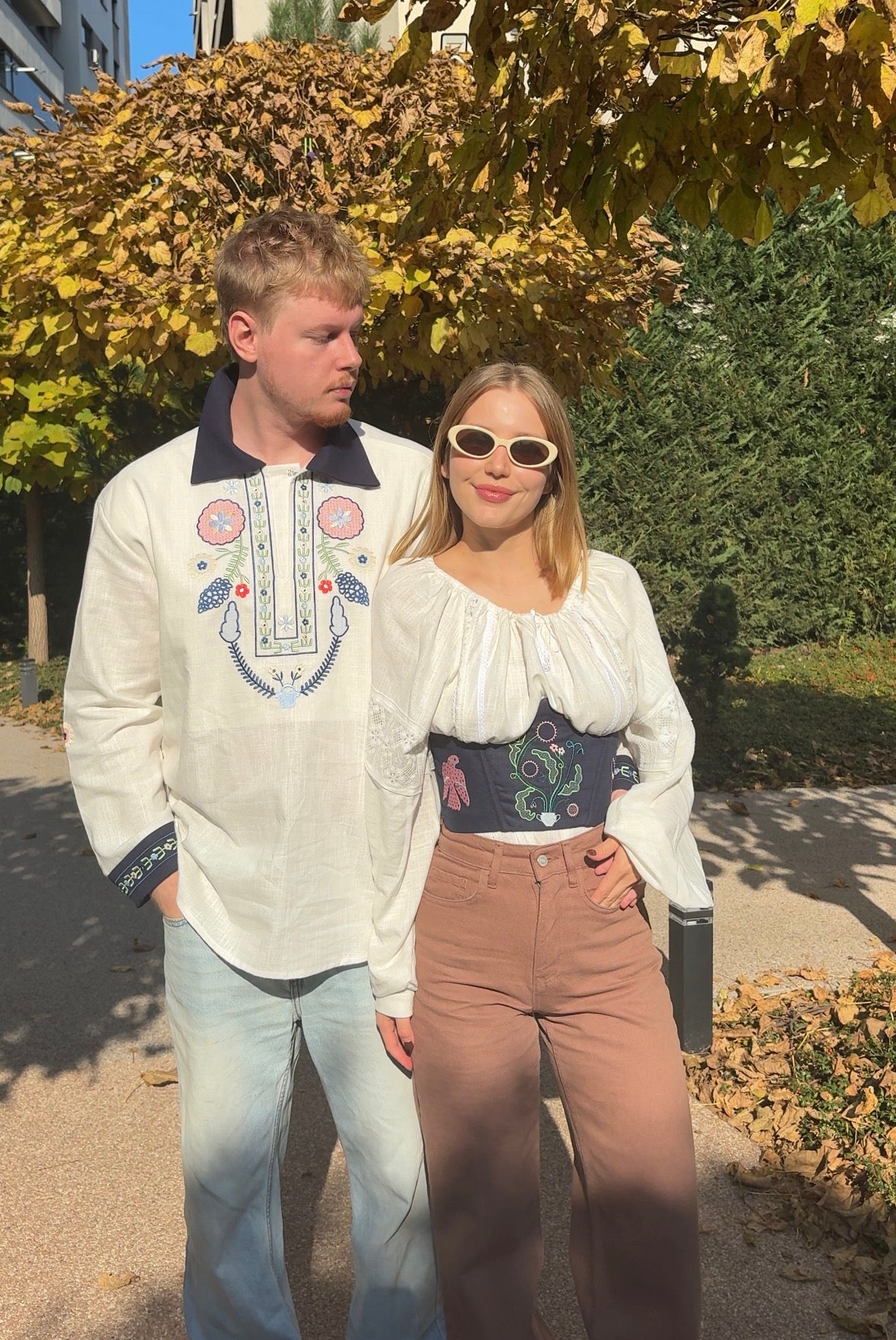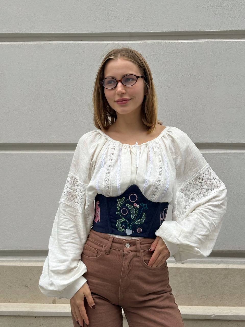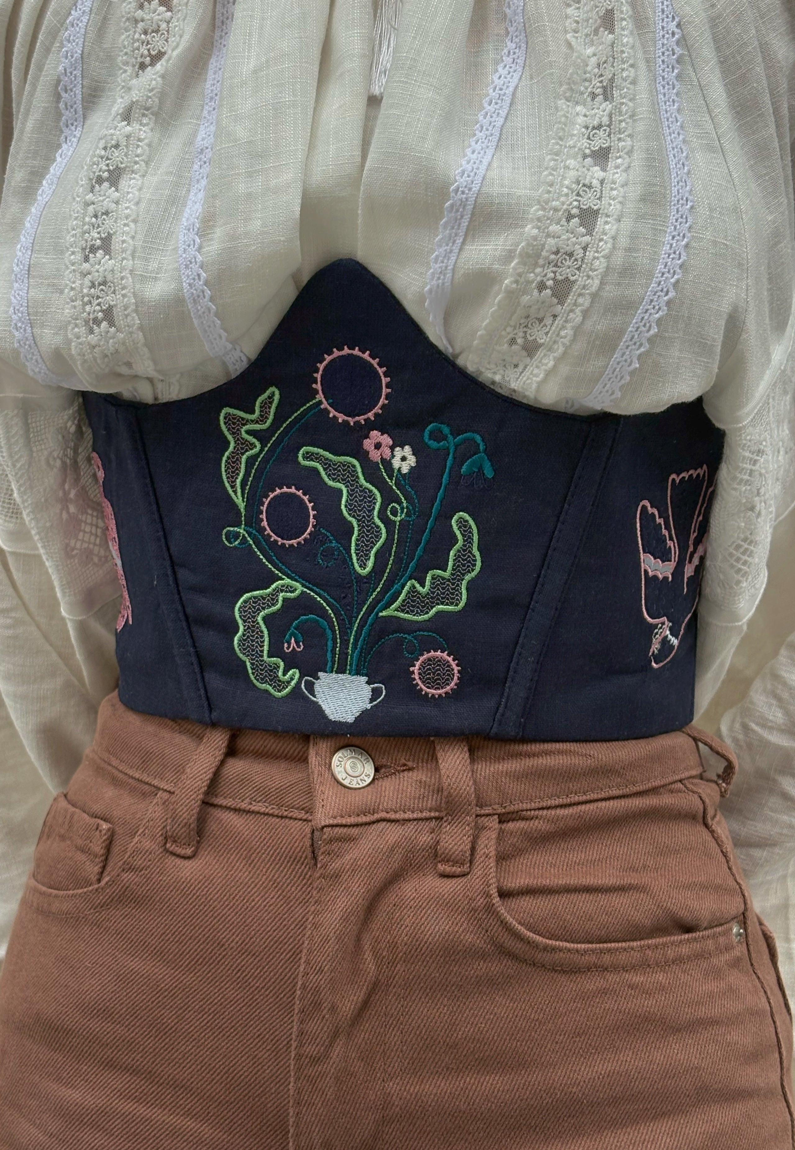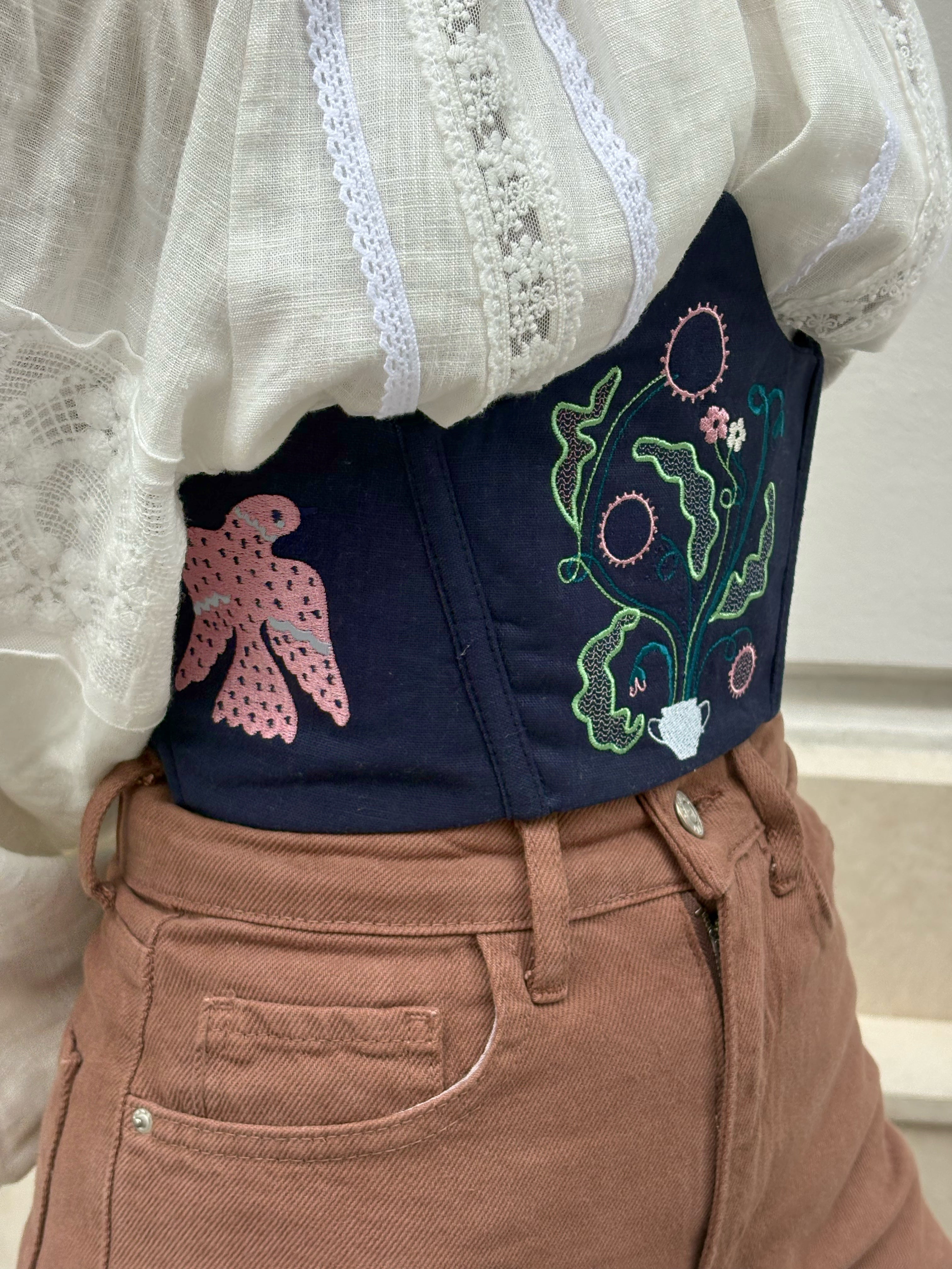 Жіночий корсет з вишивкою "Птахи" синій — це сучасне переосмислення народного мистецтва, натхненне творчістю Ганни Собачко-Шостак, видатної представниці українського декоративного розпису початку ХХ століття.