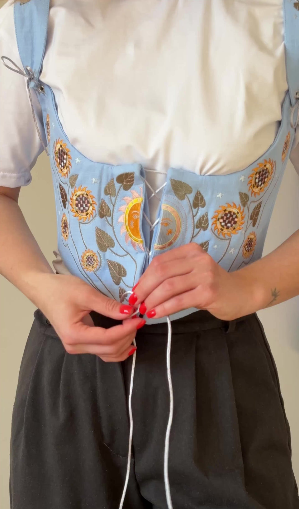 Жіночий корсет з вишивкою "Соняшник" блакитний — це історія про єдність світла й тіні, життя між Сонцем і Місяцем. Одна половинка палає золотом, як полуденне світло; інша — ніжно світиться, мов тиха ніч.