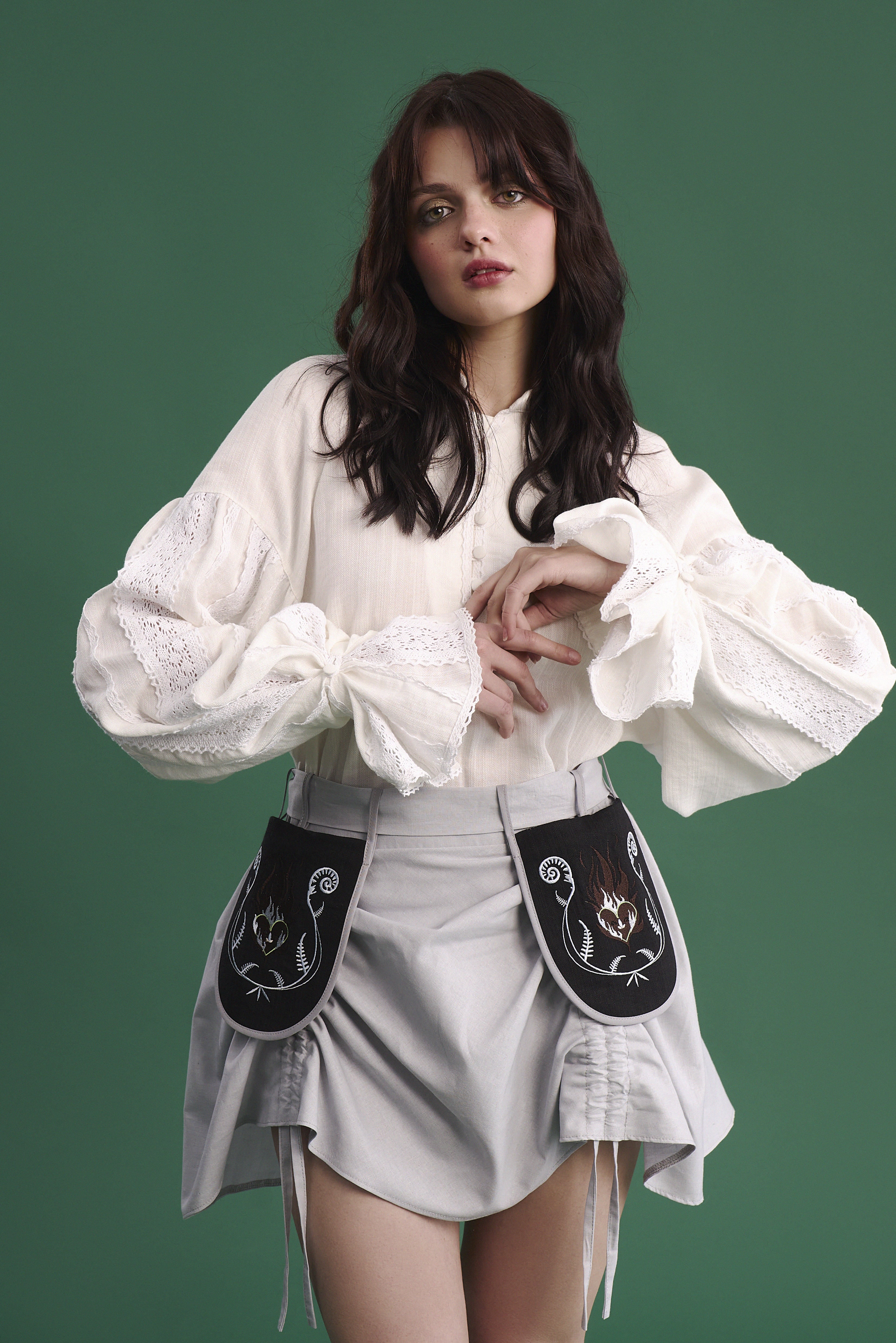 Модель має дві функціональні кишеньки, які додають зручності у повсякденному використанні, а також декоративні підвіски у формі сердечок, що створюють рух і привертають увагу до деталей. Спереду розташована вишивка, а ззаду — фірмове лого бренду.