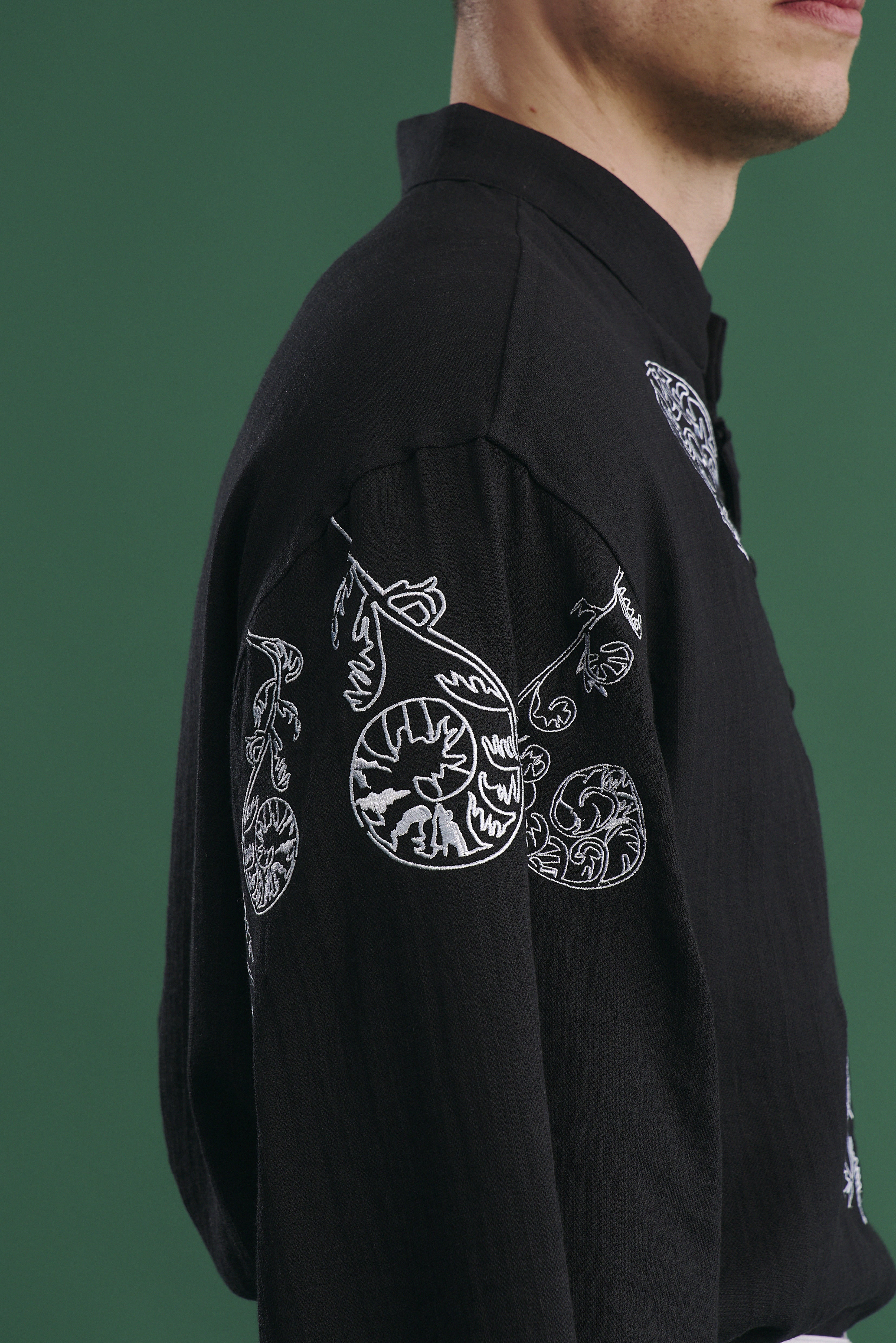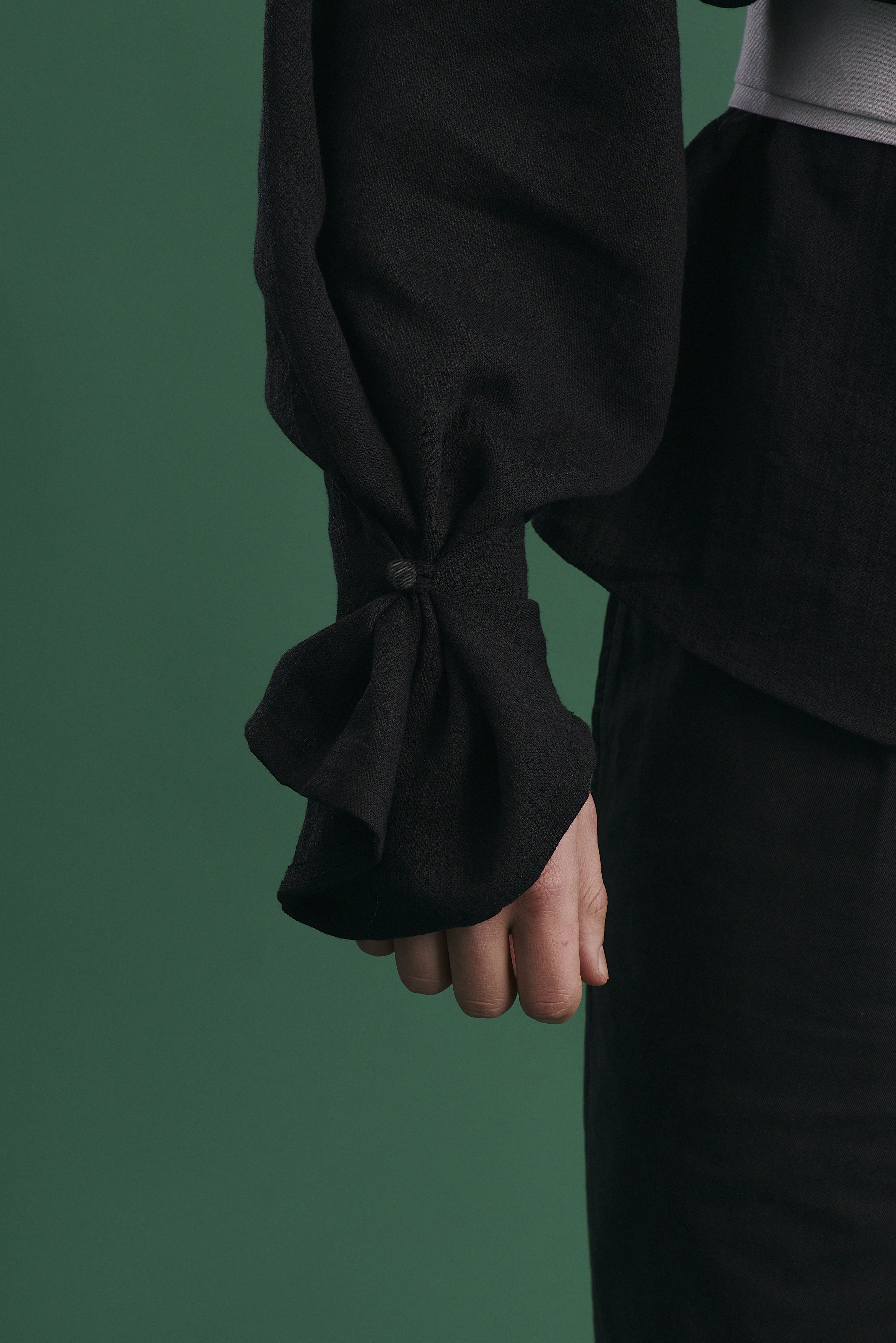 • Ґудзики на рукавах обтягнуті тканиною в колір виробу, а петлі виконані з мережива — ці деталі підкреслюють увагу до якості та естетики.