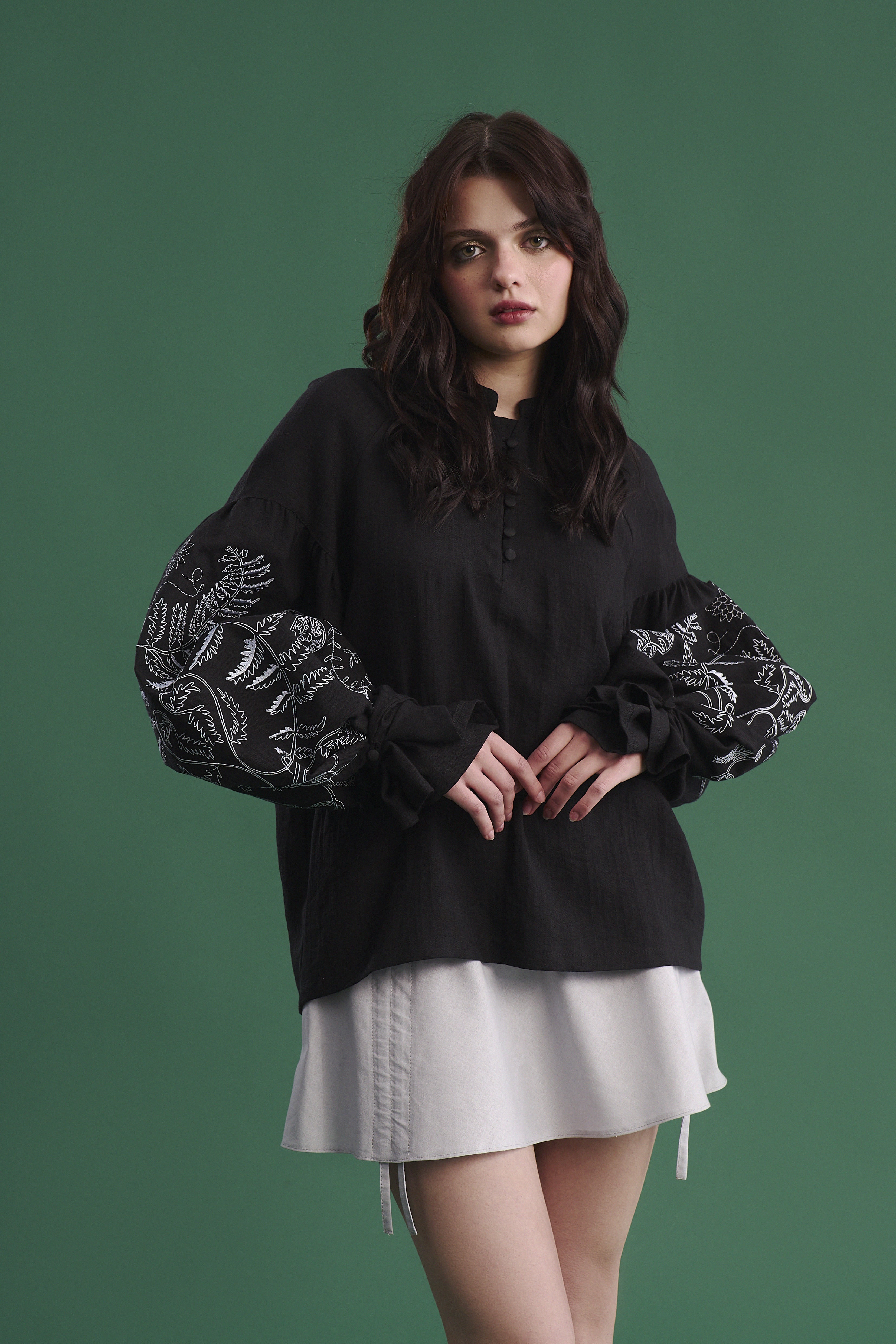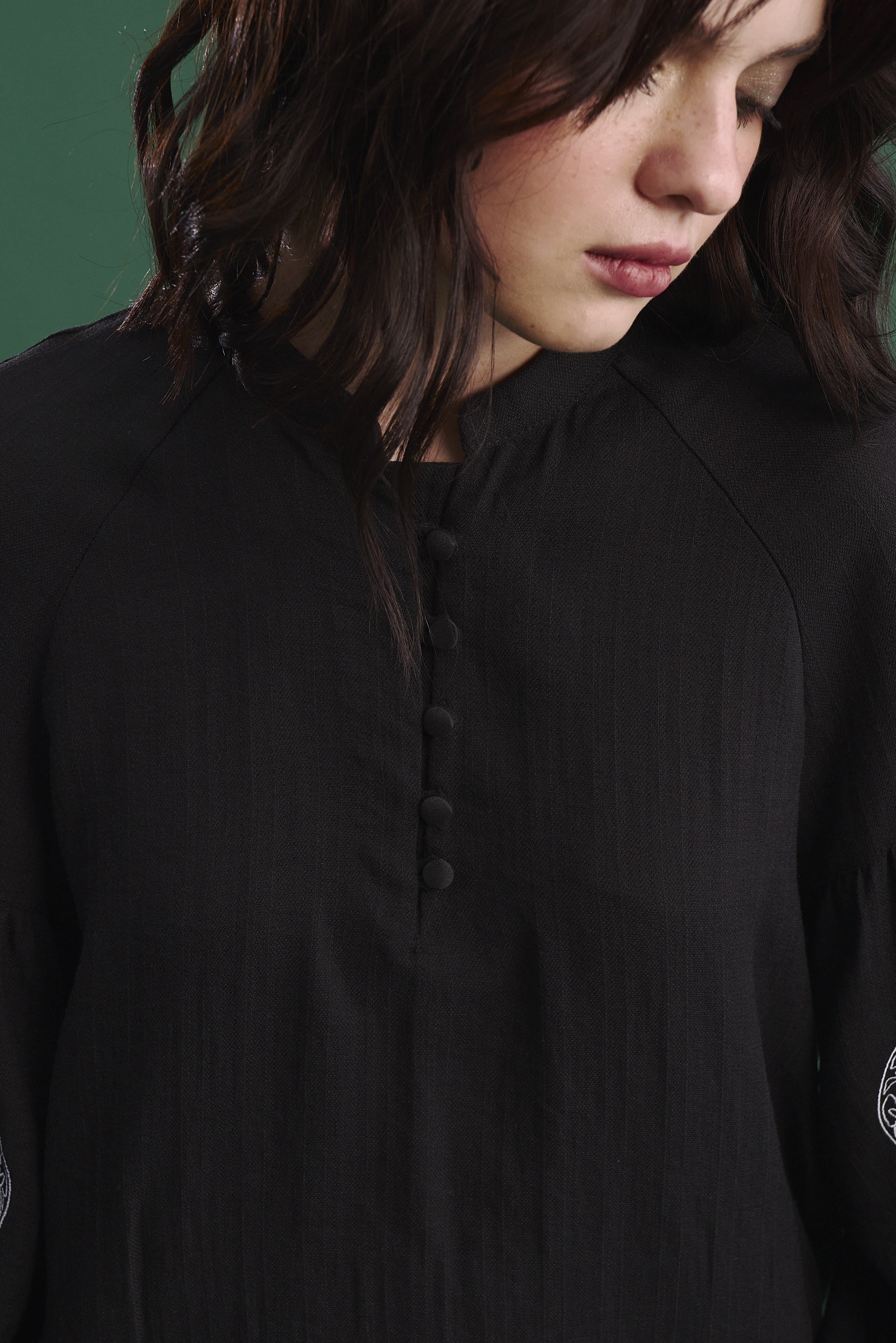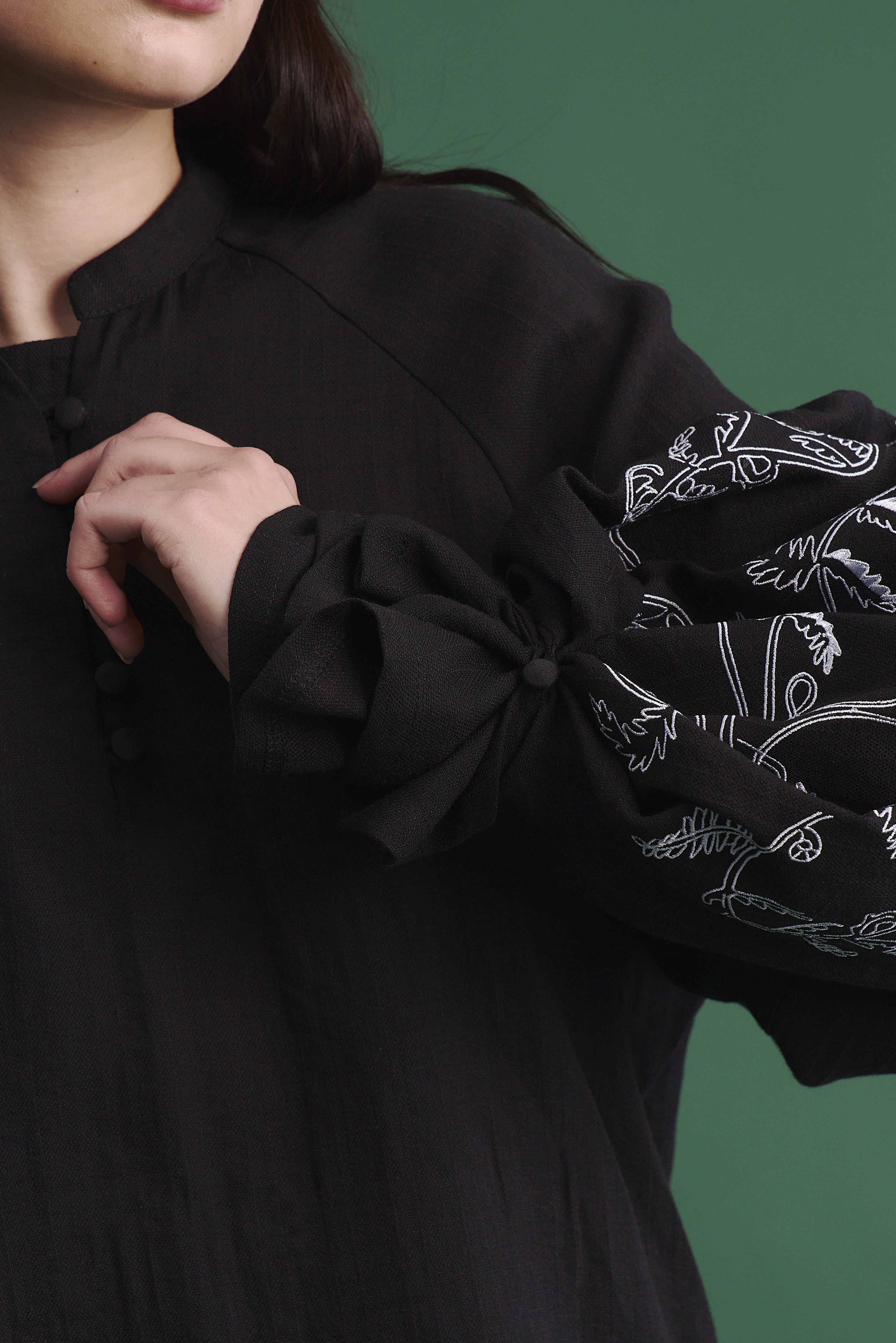 - Ґудзики обтягнуті тканиною в колір виробу, а петлі виконані з мережива — ці деталі підкреслюють увагу до якості та естетики.